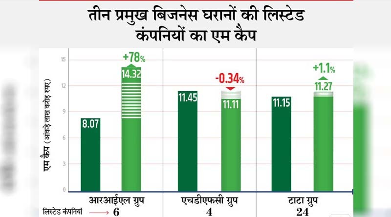 आरआईएल ग्रुप 14.32, एचडीएफसी ग्रुप 11.11 और टाटा ग्रुप 11.27 लाख करोड़ के मार्केट कैप के साथ टॉप पर