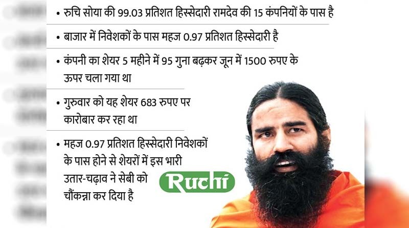 मुंबई– पिछले साल दिवालिया होने वाली रुचि सोया के शेयरों में जिस तरह से उतार-चढ़ाव बना है, उससे आनेवाले समय में ऐसी कंपनियों के लिए दिक्कत खड़ी हो सकती है। कारण की शेयर बाजार रेगुलेटर सेबी अब इस तरह के उतार-चढ़ाव से निवेशकों को बचाने के लिए नियम बदल सकता है। ऐसा इसलिए होगा क्योंकि रुचि सोया दिवालिया बिक्री में बाबा रामदेव की पतंजलि को मिली थी और इसके महज 0.97 प्रतिशत शेयर ही पब्लिक के पास है। बाकी सब प्रमोटर्स के पास है। ऐसे में यह सवाल उठ रहा है कि एक प्रतिशत से भी कम शेयर में कैसे इतना बड़ा उतार-चढ़ाव शेयरों में हो रहा है।