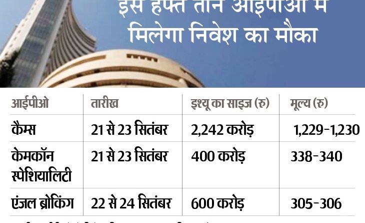 मुंबई- इस हफ्ते तीन आईपीओ आ रहे हैं। इसमें म्यूचुअल फंड के लिए सेवा देनेवाली कैम्स और केमकॉन स्पेशियालिटी केमिकल का इश्यू आज खुल रहा है। यह दोनों इश्यू 23 सितंबर को बंद होंगे। जबकि एंजल ब्रोकिंग का इश्यू कल यानी मंगलवार को खुलेगा और गुरुवार को बंद होगा। हम आपको बता रहे हैं इन आईपीओ के बारे में। कैसे इसमें आप निवेश करेंगे और कंपनी कैसी है।