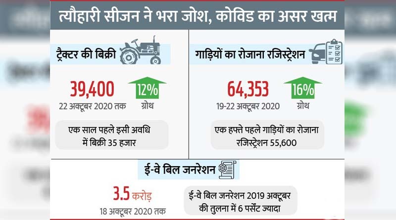 ई-वे बिल जनरेशन कोविड-19 से पहले की तुलना में अप्रैल में 16 पर्सेंट, मई में 46 पर्सेंट, जून में 79 पर्सेंट, जुलाई में 88 पर्सेंट, अगस्त में 90 पर्सेंट और सितंबर में 104 पर्सेंट के स्तर पर आ गया है। रोजाना गाड़ियों की रजिस्ट्रेशन की बात करें तो सितंबर में 60 हजार 609 गाड़ियों का रोज रजिस्ट्रेशन होता था।12 से 15 अक्टूबर के बीच 55 हजार 398 और 19 से 22 अक्टूबर तक 64,353 गाड़ियों का रजिस्ट्रेशन हुआ था।
