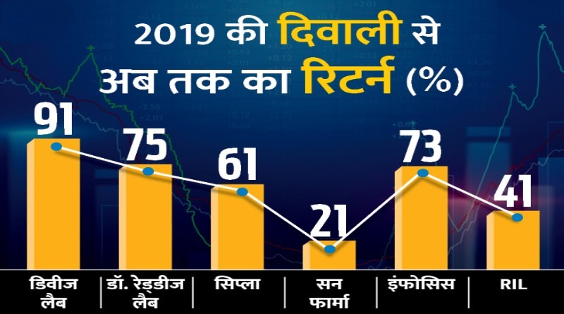 नेशनल स्टॉक एक्सचेंज (NSE) के आंकड़ों के मुताबिक सम्वत 2076 में रिटर्न देने में टॉप पर फार्मा कंपनी के शेयर रहे हैं। डिवीज लैब और डॉ रेड्डीज लैब हैं। डिवीज ने 91% और डॉ. रेड्डीज ने 75% का रिटर्न दिया है। सिप्ला ने इसी अवधि में 61% का रिटर्न दिया है तो सन फार्मा ने 21% का रिटर्न दिया है। इस दौरान बीएसई की बात करें तो यह 11% बढ़ा है।