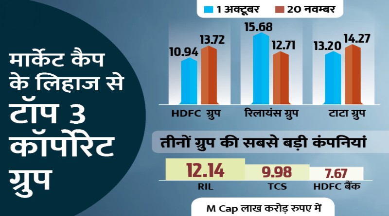 आंकड़ों के आधार पर टाटा ग्रुप की कंपनियों के मार्केट कैपिटलाइजेशन में जहां इस दौरान 1.07 लाख करोड़ रुपए की बढ़त हुई, वहीं रिलायंस की कंपनियों का मार्केट कैप 3 लाख करोड़ रुपए के करीब घट गया। HDFC ग्रुप का मार्केट कैप इसी दौरान 2.78 लाख करोड़ रुपए बढ़ गया। तीनों ग्रुप की टॉप कंपनियों की बात करें तो रिलायंस इंडस्ट्रीज लिमिटेड (RIL) के मार्केट कैप में 3 लाख करोड़ की कमी आई है।
