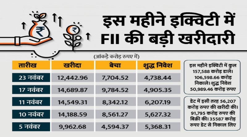 नवंबर में हर दिन FII ने शुद्ध निवेश किया है। इसमें सबसे ज्यादा निवेश 11 नवम्बर को किया गया है जो 6,207 करोड़ रुपए रहा है। 10 नवम्बर 5,627 करोड़, 9 नवम्बर को 4,869 करोड़ रुपए, 6 नवम्बर को 4,869 करोड़, 5 नवम्बर को 3,588 करोड़ और 3 नवम्बर को 2,274 करोड़ का निवेश किया गया है। इसी तरह 12 नवम्बर को 1,514 करोड़, 13 को 1,9335 और 17 नवम्बर को 4,905 करोड़ का शुद्ध निवेश इक्विटी बाजार में किया गया। वैसे 2007 अप्रैल से अब तक किसी एक महीने में सबसे अधिक शुद्ध निवेश का रिकॉर्ड FII के नाम मार्च 2019 में रहा है जिसमें 32,371 करोड़ रुपए का शुद्ध निवेश किया गया था।
