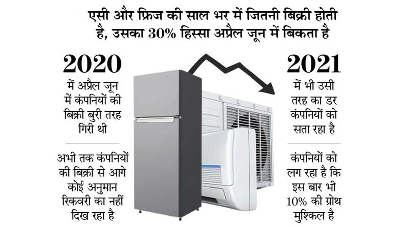 देश में बढ़ते कोविड मामलों के कारण लॉकडाउन और प्रतिबंधों के कारण लगातार दूसरे वर्ष एयर कंडीशनर (AC) और रेफ्रिजरेटर की बिक्री अप्रैल और मई के पीक सीजन के दौरान प्रभावित हुई है। महामारी की स्थिति ने लंबे चौड़े टारगेट को छोड़कर कंपनियों को अपने लक्ष्य को फिर से सेट करने और प्री-कोविड (2019) की बिक्री संख्या को हासिल करने के लिए मजबूर किया है।