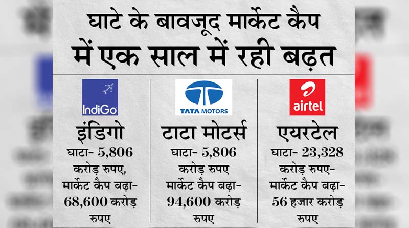 इंडिगो को चलाने वाली इंटरग्लोब की बात करें तो यह भी भारी-भरकम घाटे में रही है। इसका घाटा अप्रैल 2020 से मार्च 2021 के बीच 5,806 करोड़ रुपए का रहा है। पर इसके मार्केट कैप में 28 हजार करोड़ रुपए की बढ़त हुई है। इसका शेयर अभी 1782 रुपए पर है जबकि मार्केट कैप 68,600 करोड़ रुपए है। इनके अलावा सरकारी बैंक पंजाब एंड सिँध बैंक और आलोक इंडस्ट्रीज के भी मार्केट कैप में इसी तरह की बढ़त रही है। हालांकि यह सभी घाटे में रहे हैँ।