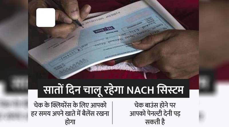 अब NACH सभी सातों दिन उपलब्ध होगा, इसलिए आपको चेक के माध्यम से पेमेंट करने पर पहले अधिक सावधानी बरतनी होगी। अब ये नॉन वर्किंग डे यान साप्ताहिक छुट्टी और नेशनल हॉलिडे के दिन भी काम करेगा। इसलिए अब चेक जारी करने से पहले देख लें कि खाते में पैसा है या नहीं। वरना चेक बाउंस हो जाएगा। चेक बाउंस होने पर आपको खाते से पेनाल्टी भरनी होगी।
