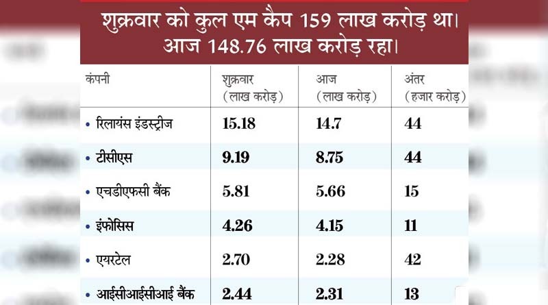 एक महीने की बात करें तो सबसे ज्यादा गिरने वाले शेयरों में वोडाफोन 13.45 से गिर कर 9.12 रुपए पर आ गया है। रिलायंस इंडस्ट्रीज का शेयर 2,368 से गिर कर 2,181 रुपए, टीसीएस का शेयर 2,534 से गिरकर 2,331 रुपए, एक्सिस बैंक का शेयर 533 से गिर कर 402 रुपए, बजाज फाइनेंस का शेयर 3,750 से गिर कर 3,027, आईटीसी का 198 से गिर कर 166 रुपए पर आ गया है। इसी तरह से आईसीआईसीआई बैंक का शेयर 422 से गिरकर 335 रुपए, एसबीआई का 232 से गिरकर 176 रुपए पर आ गया है। वैसे मार्केट कैप में 18 सितंबर के बाद जिन अन्य कंपनियों को घाटा हुआ है उसमें कोटक महिंद्रा बैंक को सात हजार करोड़ का नुकसान हुआ है। इसका बाजार पूंजीकरण 2.53 लाख करोड़ से घटकर 2.46 लाख करोड़ रुपए हो गया है। एचयूएल का 4.93 से घटकर 4. 88 लाख करोड़, एचडीएफसी का 5.81 से घटकर 5.66 लाख करोड़ रुपए हो गया है।
