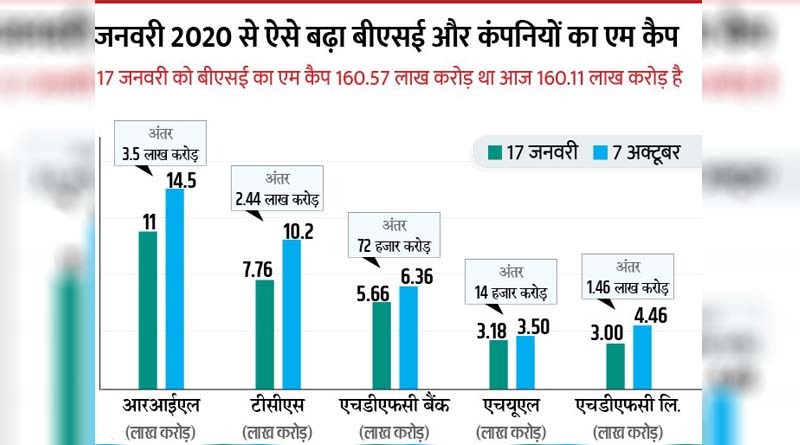 वैसे मार्केट कैप में जो बढ़त दिखी है, उसमें टॉप 10 कंपनियों के साथ कुछ छोटी-छोटी कंपनियों का भी योगदान रहा है। इसके साथ कुछ नई कंपनियां लिस्ट भी हुई हैं और उनका भी मार्केट कैप सेंसेक्स में जुड़ा है। कंपनियों के लिहाज से देखें तो सबसे ज्यादा रिलायंस इंडस्ट्रीज का मार्केट कैप बढ़ा है। 17 जनवरी को इसका एम कैप 11 लाख करोड़ रुपए था जो अब 14.50 लाख करोड़ रुपए है। यानी 3.5 लाख करोड़ रुपए का इजाफा हुआ है।