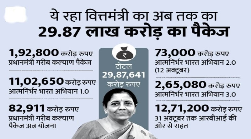 मुंबई– वित्त मंत्री निर्मला सीतारमण ने तीसरी बार राहत पैकेज की घोषणा की है। अब कुल राहत पैकेज 29.87 लाख करोड़ रुपए का हो गया है। यानी देश के कुल सकल घरेलू उत्पाद (GDP) का 15% हिस्सा राहत पैकेज में दिया गया है। आज आत्मनिर्भर भारत अभियान-3 में कुल 2,65,080 करोड़ रुपए की घोषणा की गई है। हालांकि इसमें बुधवार की पीएलआई स्कीम को भी शामिल किया गया है। इसी के साथ उन्होंने कई सेक्टर्स के लिए राहत दी है।