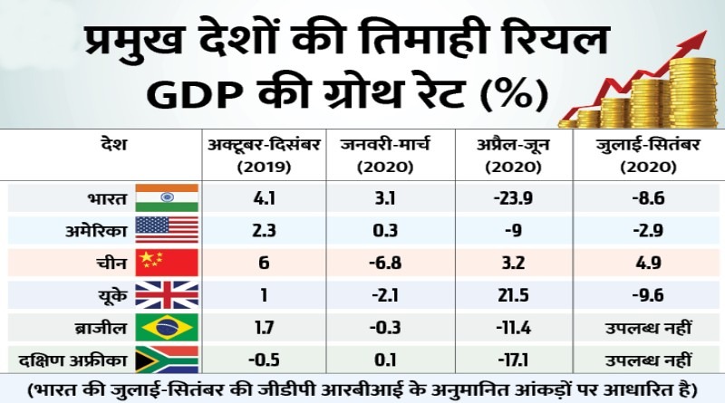 विश्लेषक अक्सर एक मंदी पर तभी विचार करते हैं जब जीडीपी में गिरावट लगातार दो महीनों में देखी जाती है। इस तरह वास्तविक तिमाही जीडीपी को आर्थिक गतिविधियों के उपाय और “तकनीकी मंदी” का पता लगाने के लिए एक बेंचमार्क के रूप में स्वीकार किया गया है। इस परिभाषा के अनुसार, जैसा कि आंकड़ों से पता चलता है भारत ने सितंबर के अंत में मंदी के दौर में प्रवेश किया। ब्रिटेन मंदी की अपनी तीसरी तिमाही में है। ब्राजील और इंडोनेशिया भी मंदी में हैं, जबकि दक्षिण अफ्रीका अब तक बचा है। चीन, जहां महामारी शुरू हुई, अब उबरने लगा है।