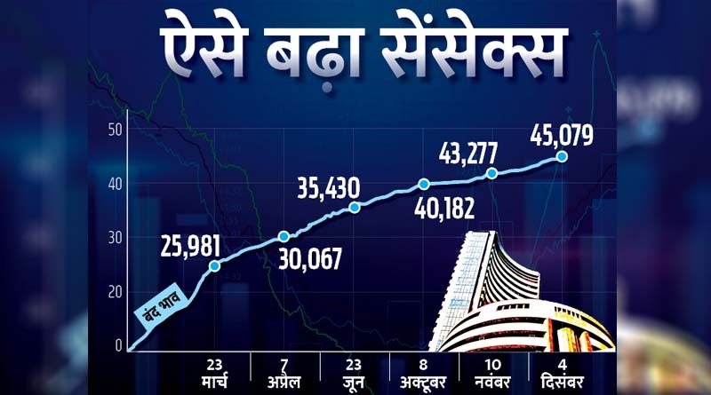 मुंबई– बॉम्बे स्टॉक एक्सचेंज (BSE) का इंडेक्स पहली बार 45 हजार के आंकड़े को पार कर गया है। अब यह 50 हजार की ओर जा रहा है। 9 महीने में यह 80% बढ़ा है। 23 मार्च को 25,981 पर बंद हुआ था। सेंसेक्स में यह स्तर दिसंबर 2016 के बाद का सबसे निचला स्तर था।