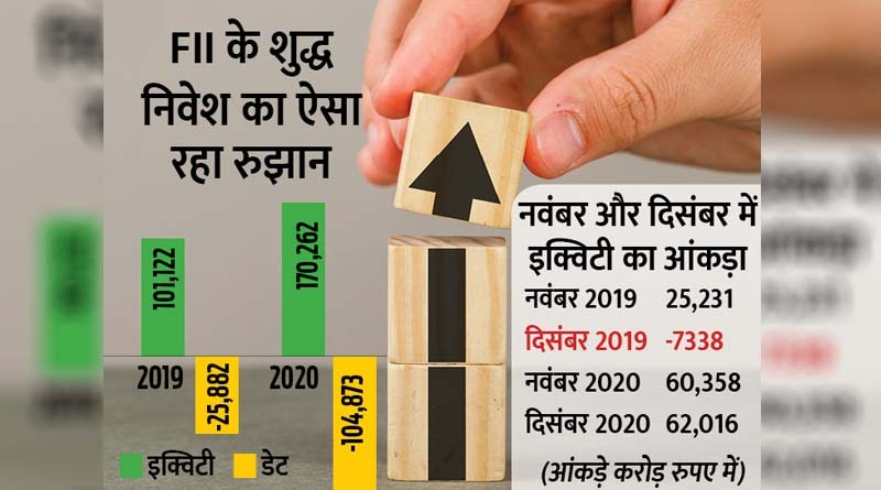 बता दें कि जब से भारतीय इक्विटी बाजार में FII निवेश कर रहे हैं, नवंबर और दिसंबर में उन्होंने किसी एक महीने में सबसे ज्यादा शुद्ध निवेश इक्विटी बाजार में किया है। नवंबर में इन्होंने 60 हजार 358 करोड़ रुपए का जबकि दिसंबर में 62 हजार 16 करोड़ रुपए का निवेश किया है। यही नहीं, 2020 के जनवरी से दिसंबर के बीच इन्होंने 1 लाख 70 हजार 262 करोड़ रुपए का शुद्ध निवेश किया है।