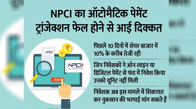 मुंबई– म्यूचुअल फंड निवेशकों को जबरदस्त झटका लगा है। पिछले 10 दिनों से वे बाजार की तेजी का फायदा उठाने में चूक गए हैं। ऐसा इसलिए क्योंकि नेशनल पेमेंट्स कॉर्पोरेशन ऑफ इंडिया (NPCI) का ऑटो पे लेन-देन सिस्टम फेल हो गया। इससे ऑन लाइन निवेश करने वालों का पैसा तो खाते से कटा, लेकिन उनके खाते में म्यूचुअल फंड स्कीम की यूनिट नहीं आई। या तो कुछ के खाते में आई तो काफी देर से आई।