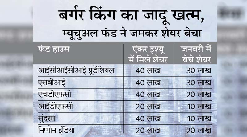 आंकड़े बताते हैं कि IPO से पहले दिसंबर में बर्गर किंग में एंकर निवेशक के रूप में म्यूचुअल फंड हाउसों ने शेयर खरीदा था। इसमें ICICI प्रूडेंशियल म्यूचुअल फंड, SBI म्यूचुअल फंड, HDFC म्यूचुअल फंड, बिरला म्यूचुअल फंड ने 40-40 लाख शेयर खरीदे थे। जनवरी में ही इन सभी ने 20-20 लाख शेयर बेच दिया।
