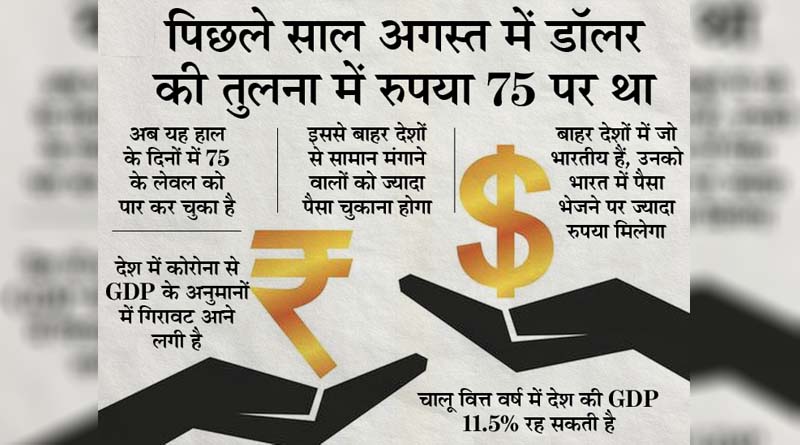 भारतीय रुपया डॉलर की तुलना में पिछले साल अगस्त में 75 पर पहुंचा था। उसके बाद अब यह फिर से इसी लेवल पर आ गया है। सोमवार को तो यह 75.055 पर पहुंच गया था। नोमुरा होल्डिंग के अर्थशास्त्रियों ने भारत के विकास को लेकर अपने अनुमानों को बदल दिया है और वे कोरोना की दूसरी लहर की वजह से विकास को डाउनग्रेड कर दिए हैं। भारत की GDP की वृद्धि का लक्ष्य उन्होंने 2021-22 में 11.5% कर दिया है। इसका पहले का अनुमान 12.4% का था।