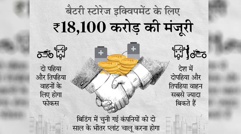 मुंबई– केंद्र सरकार ने बैटरी स्टोरेज इक्विपमेंट के लिए प्रोडक्शन लिंक्ड इंसेंटिव्ज (PLI) की 18,100 करोड़ रुपए की स्कीम को मंजूरी दे दी है। यह मंजूरी आयात के खर्च को कम करने और घरेलू इंधन को बढ़ावा देने के लिए की गई है। इससे देश में इलेक्ट्रिक मोबिलिटी को रफ्तार मिलेगी। तिपहिया, चार पहिया और हैवी व्हीकल को फायदा होगा। इससे 2 से ढाई लाख करोड रुपए के तेल के बिल की बचत होगी।