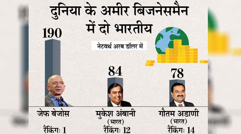 अडाणी की नेटवर्थ में इस साल में 45 अरब डॉलर बढ़ी है। जबकि मुकेश अंबानी की केवल 8 अरब डॉलर नेटवर्थ बढ़ी है। चीन के अलीबाबा ग्रुप के जैकमा इस लिस्ट में 27 वें नंबर पर हैं। एचसीएल के चेयरमैन शिव नाडार 70 वें नंबर पर और विप्रो के अजीम प्रेमजी 43 वें नंबर पर दुनिया के सबसे अमीर बिजनेसमैन की लिस्ट में हैं। टॉप 100 अमीर बिजनेसमैन में भारत की तुलना में चीन के बिजनेसमैन हैं। 190 अरब डॉलर की नेटवर्थ के साथ जेफ बेजोस पहले नंबर पर हैं। टेस्ला के एलन मस्क तीसरे नंबर के सबसे अमीर बिजनेसमैन हैं।