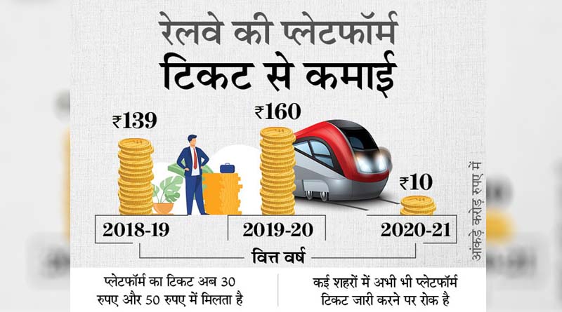 सूचना का अधिकार (RTI) के तहत रेलवे ने जानकारी दी है। उसने कहा है कि उसे प्लेटफॉर्म टिकट की बिक्री बंद करने से इससे होने वाली कमाई में 94% का घाटा हुआ है। कोरोना की वजह से लोगों को रेलवे स्टेशन पर रोकने के लिए प्लेटफॉर्म टिकट की कीमत पहले 50 रुपए की गई, फिर इसे बंद कर दिया गया था। रेलवे ने कहा कि उसने केवल 10 करोड़ रुपए 2020-21 में प्लेटफॉर्म टिकट से कमाया है।