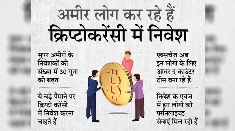 वजीरएक्स के मुख्य कार्यकारी निश्चल शेट्टी ने कहा कि ये लोग क्रिप्टो के लिए अपने पोर्टफोलियो का 3% से 5% निवेश इसमें कर रहे हैं। इसमें बिटकॉइन सबसे लोकप्रिय है। शेट्टी ने कहा कि पिछले दो साल की तुलना में एचएनआई की संख्या पिछले 8-12 महीनों में काफी तेजी से बढ़ी है। उन्होंने कहा कि मुझे लगता है कि वे सब जोखिम उठाना चाहते है क्योंकि वे डाइवर्सिफाइ पोर्टफोलियो रखने में विश्वास करते हैं।
