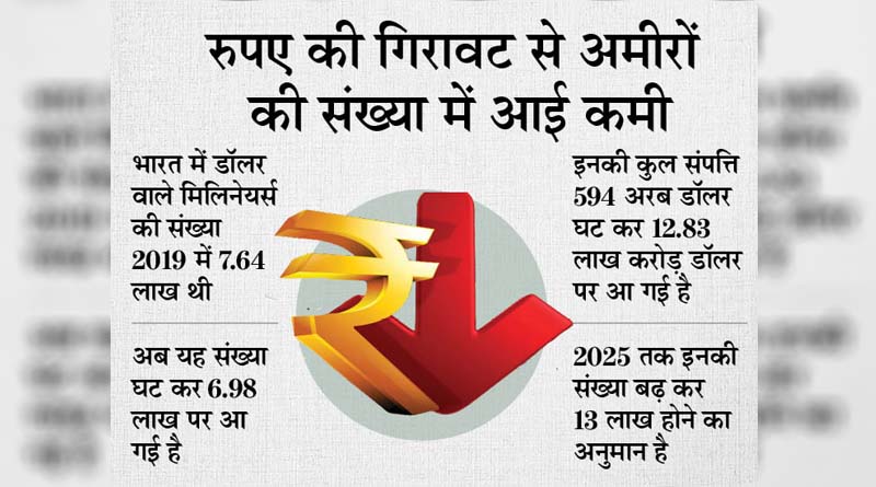 क्रेडिट सुइस रिसर्च इंस्टीट्यूट की रिपोर्ट के मुताबिक, भारत में करोड़पतियों की संख्या 2019 में 7.64 लाख से घटकर 6.98 लाख हो गई। उनकी कुल संपत्ति 12.83 लाख करोड़ डॉलर रही है। यानी इसमें पिछले साल 595 अरब डॉलर की गिरावट आई है। रिपोर्ट का अनुमान है कि साल 2025 तक इनकी संख्या में 81.8% की बढ़त होगी और यह 13 लाख पर पहुंच जाएगी।