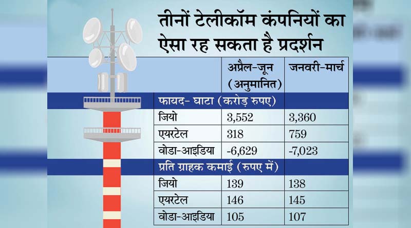 देश की सबसे बड़ी टेलीकॉम कंपनी जियो की बात करें तो इसका फायदा जून में 3,552 करोड़ रुपए रह सकता है। मार्च में 3,360 करोड़ रुपए का फायदा हुआ था। रेवेन्यू जून में 17,950 करोड़ रुपए रह सकता है जो मार्च तिमाही में 17,381 करोड़ रुपए था। प्रति ग्राहक कमाई में एक रुपए की बढ़त हो सकती है। यह 139 रुपए रह सकती है जो मार्च में 138 रुपए थी।