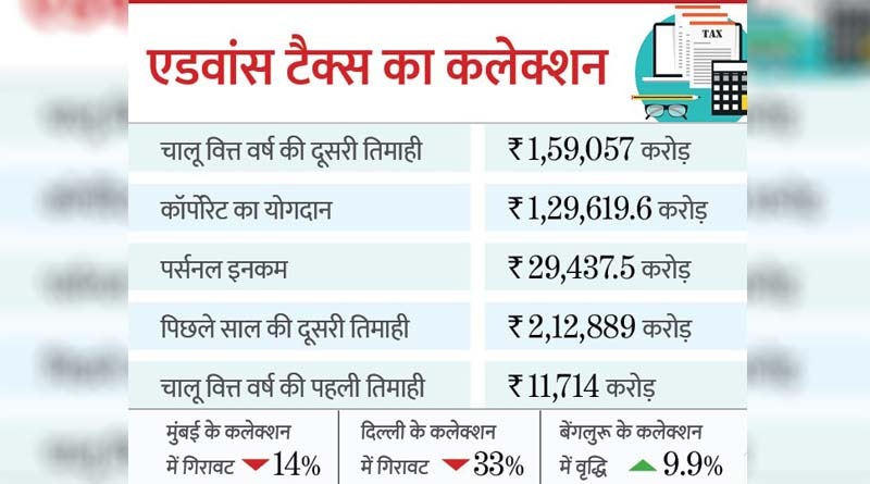 Read moreमुंबई- दूसरी तिमाही में एडवांस टैक्स कलेक्शन में 25.5 प्रतिशत की गिरावट आई है। यह एक लाख 59 हजार 57 करोड़